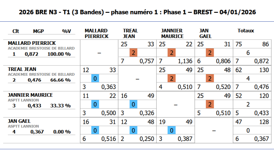 En Nationale 3, Pierrick Mallard s'impose avec autorité dans sa poule avec une partie à plus de 1 de moyenne et une moyenne générale sur la journée aux alentours de 0.900. Un résultat lui permettant de retourner à l'étage supérieur.